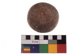 | Description / विवरण | A complete specimen of a sling ball having rough surface and reddish black colour. |
