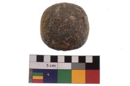 | Description / विवरण | A complete specimen of a sling ball having rough surface and reddish black colour. |