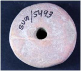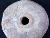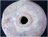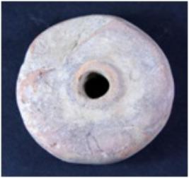 Circular wheel has damaged edges and surface, hole is at the centre.