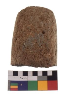 | Description / विवरण | A complete specimen of an oval shaped muller. It has battered surface along with curved ridges and oval section. |