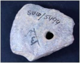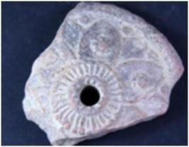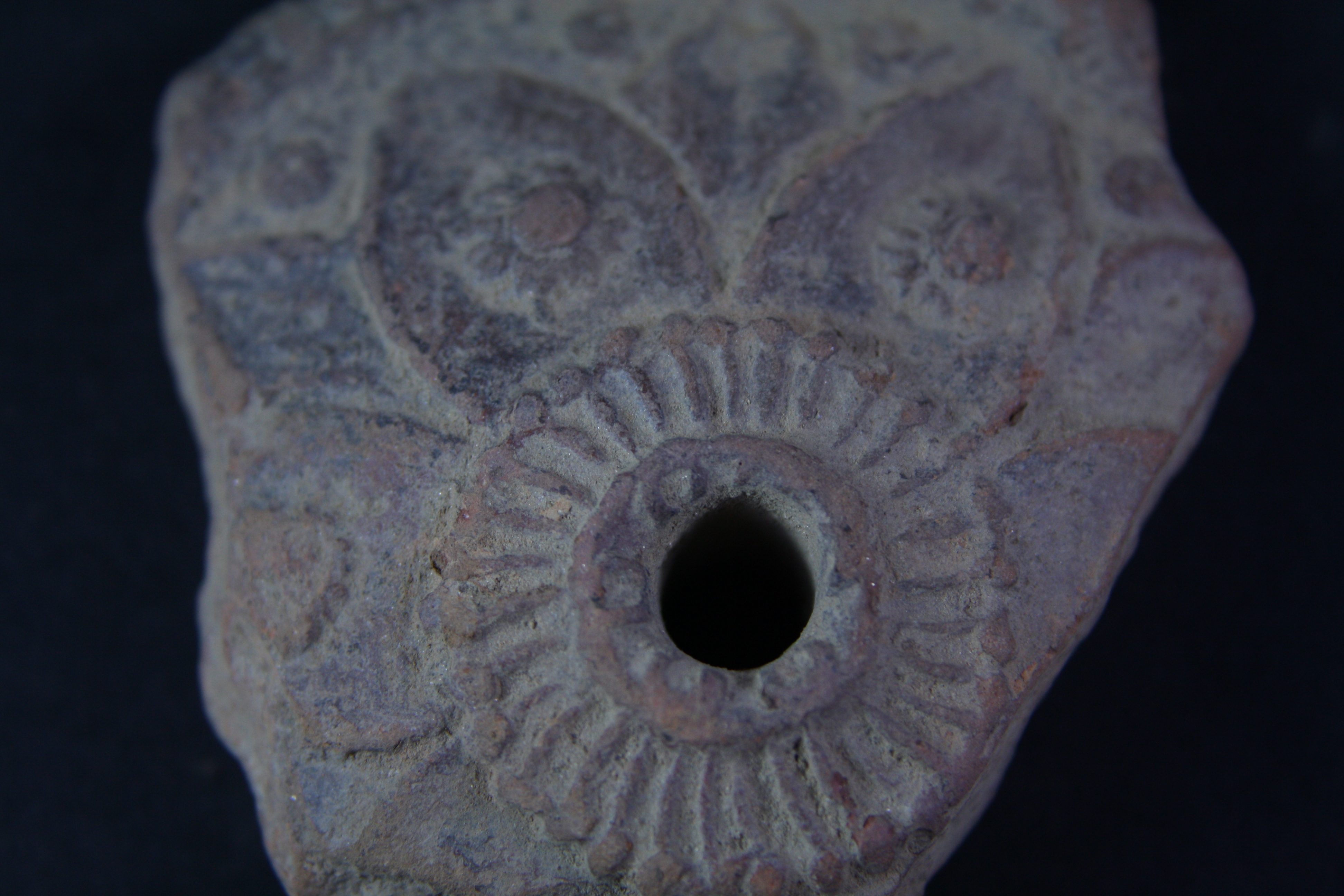 Broken fragment of a wheel, floral patterns seem to be embossed on it., a hole is there.
