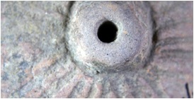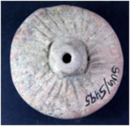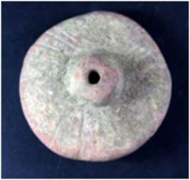 Circular wheel has incised lines all over it, a hole is there, area enclosing the hole is slightly raised.