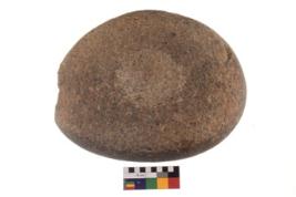 | Description / विवरण | A complete specimen of an oval shaped muller. It has battered surface along with curved ridges and oval section. |