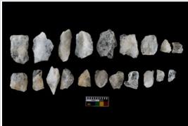| Description / विवरण | There are n-20 of intact flake cores made up of Quartz. Some of them have bulge of percussion and some are flat flakes. |