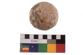 | Description / विवरण | A complete specimen of a sling ball having rough surface and reddish black colour. |