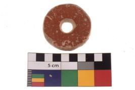 | Description / विवरण | A specimen of spindle whorl eroded from the area around the perforation and diameter edge. The outer edge is uneven. It is well-fired and reddish in colour. |
