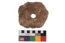 | Description / विवरण | A specimen of spindle whorl eroded from the area around the perforation and diameter edge. The outer edge is uneven. It is well-fired and reddish in colour. |
