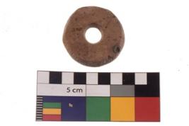 | Description / विवरण | A specimen of spindle whorl eroded from the area around the perforation and diameter edge. The outer edge is uneven. It is well-fired and reddish in colour. |