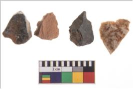 | Description / विवरण | Four worked flakes, some are irregular whereas some are tapering at one end. Most of them are having sharp edges. |