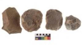 | Description / विवरण | There are n-4 of utilized flake cores. There are multidirectional irregular dominant scar pattern on both dorsal and ventral face of the cores. Some of them bulge of percussion and some are flat flake cores. |