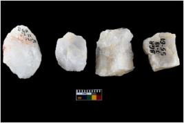 | Description / विवरण | A specimen of a fluted core having very few fluted marks before removing of blades form it. It is roughly rounded in shape and white in colour. |