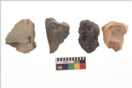 | Description / विवरण | Four worked flakes, some are uneven whereas some are tapering at one end. Most of them are having sharp edges. |