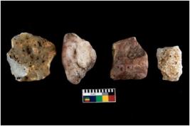 | Description / विवरण | There are n-4 of intact cores made up of Chalcedony.There are multi directional irregular dominant scar pattern on both dorsal and ventral face of the cores. |