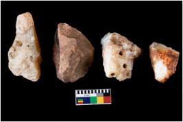 | Description / विवरण | There are n-4 of intact cores. Out of them 2 are made up Chalcedony, 1 is made up of Agate and 1 is made up of Chert.There are multi directional irregular dominant scar pattern on both dorsal and ventral face of the cores. |