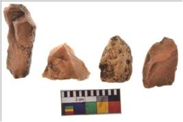 | Description / विवरण | Four worked flakes with sharp edges. Some of them are tapering at one end. |