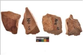 | Description / विवरण | Four worked flakes with sharp edges. Some of them are tapering at one end. |