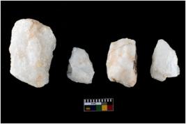 | Description / विवरण | A specimen of a fluted core having very few fluted marks before removing of blades form it. It is roughly rounded in shape and white in colour. |