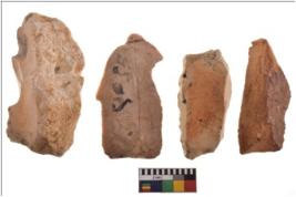 | Description / विवरण | Four worked flakes with sharp edges. Some of them are tapering at one end. |