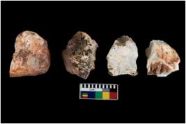 | Description / विवरण | There are n-4 of intact cores. Out of them 2 are made up Chalcedony, 1 is made up of Agate and 1 is made up of Chert.There are multidirectional irregular dominant scar pattern on both dorsal and ventral face of the cores. |
