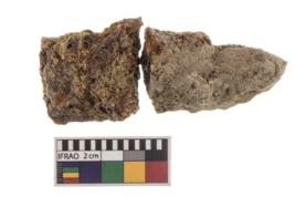 | Description / विवरण | A fragment of Iron Knife having curved body with pointed end and thick short round tang. The body has thin sharp blade edge on one side and thick blunt edge on the other side. |