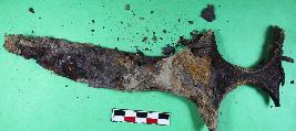 | Description / विवरण | Dagger having long blade with short broken hilt. It has heavy incrustations. |