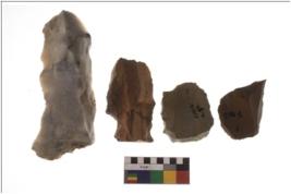 | Description / विवरण | Four worked flakes with sharp edges and few are tapering at one end. |