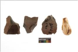 | Description / विवरण | Four worked flakes with sharp edges and few are tapering at one end. |