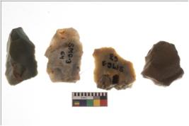 | Description / विवरण | Four worked flakes with sharp edges and few are tapering at one end. |