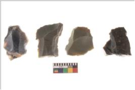 | Description / विवरण | Four worked flakes with sharp edges and few are tapering at one end. |