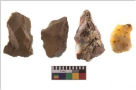 | Description / विवरण | Four worked flakes with sharp edges and few are tapering at one end. |