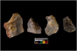 | Description / विवरण | Four worked flakes with sharp edges and few are tapering at one end. |