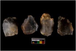 | Description / विवरण | Four worked flakes with sharp edges and few are tapering at one end. |