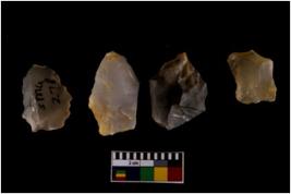 | Description / विवरण | Four worked flakes with sharp edges and few are tapering at one end. |