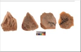 | Description / विवरण | Four worked flakes with sharp edges and few are tapering at one end. |