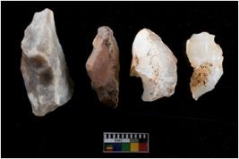 | Description / विवरण | There are n-4 of intact cores. Out of them 2 are made up Chalcedony and 2 are made up of Chert.There are multidirectional irregular dominant scar pattern on both dorsal and ventral face of the cores. |