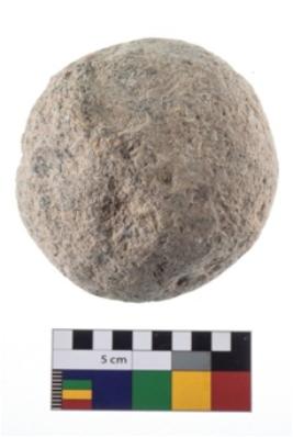 | Description / विवरण | A partially broken specimen of roughly round shaped hammer stone with battered periphery along with the circumference. |
