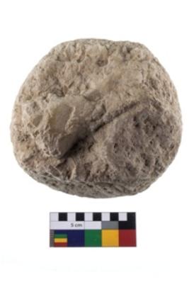 | Description / विवरण | A partially broken specimen of roughly round shaped hammer stone with battered periphery along with the circumference. |