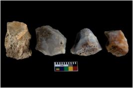 | Description / विवरण | There are n-4 of intact flake cores. Out of them 1 is made up Chalcedony and 3 are made up of Chert.There are multidirectional irregular dominant scar pattern on both dorsal and ventral face of the cores. |