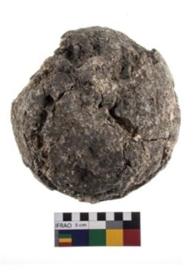 | Description / विवरण | A partially broken specimen of roughly round shaped hammer stone with battered periphery along with the circumference. |