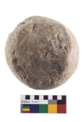 | Description / विवरण | A partially broken specimen of roughly round shaped hammer stone with battered periphery along with the circumference. |