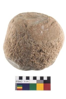 | Description / विवरण | A partially broken specimen of roughly round shaped hammer stone with battered periphery along with the circumference. |