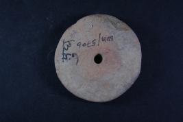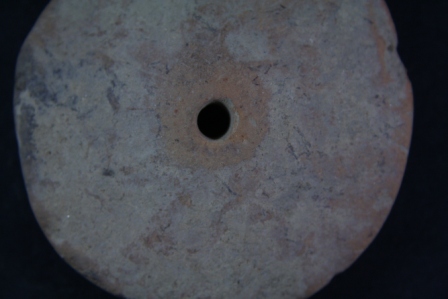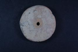 Circular wheel with a hole at the centre, area near hole is flaked.