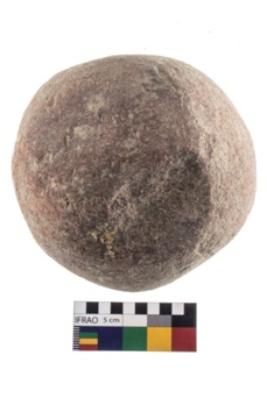 | Description / विवरण | A partially broken specimen of roughly round shaped hammer stone with battered periphery along with the circumference. |
