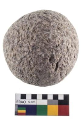 | Description / विवरण | A partially broken specimen of roughly round shaped hammer stone with battered periphery along with the circumference. |