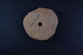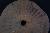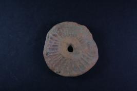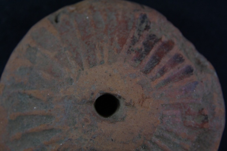 Circualr wheel has liner motifs to outline spokes of wheel, edge is damaged on one side.