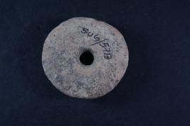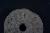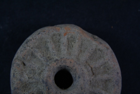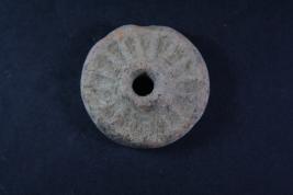 Circualr wheel has linear motifs on its surface to outline the spokes, a hole is there at centre. Edge is slightly damaged.
