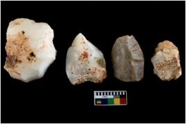 | Description / विवरण | There are n-4 of intact flake cores. Out of them 1 is made up Chalcedony and 3 are made up of Chert.There are multidirectional irregular dominant scar pattern on both dorsal and ventral face of the cores. |