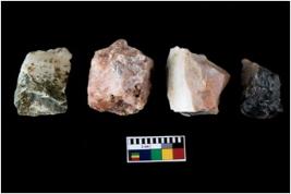 | Description / विवरण | There are n-4 of intact flake cores. Out of them 1 is made up Chalcedony and 3 are made up of Chert.There are multidirectional irregular dominant scar pattern on both dorsal and ventral face of the cores. |
