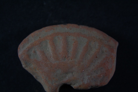 Fragment of a wheel has linear motifs on its surface to outline the spokes.