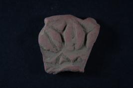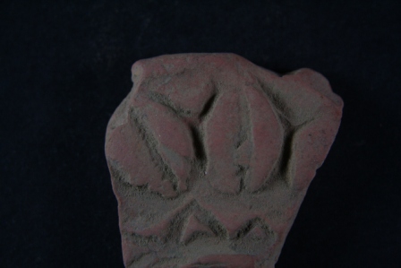 Fragment of a wheel has leaf shaped motifs embossed on its surafce.